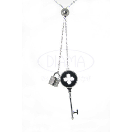 Срібне кольє з замком та ключем. Вставка- чорна кераміка та білий циркон. Срібло 925 проби, покрите родієм.