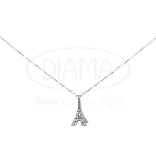 Срібне кольє з білим цирконом в формі Ейфелевої вежі. Срібло 925 проби, покрите родієм. Розмір 25 мм.