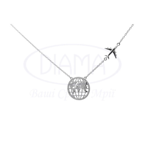 Срібне кольє з білим цирконом в формі Планети та Літака. Срібло 925 проби, покрите родієм. Розмір 20,5 мм.