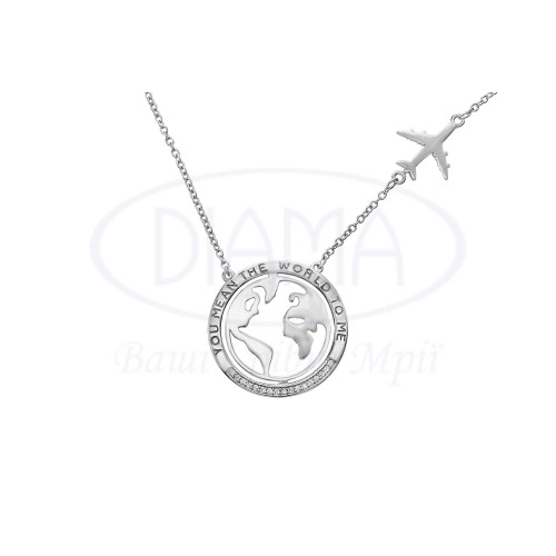 Срібне кольє з білим цирконом в формі Планети та Літака. Срібло 925 проби, покрите родієм. Розмір 25 мм. В наборі є кольє та браслет.