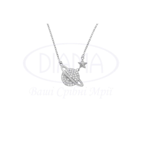 Срібне кольє з білим цирконом в формі Планети та Зірки. Срібло 925 проби, покрите родієм. Діаметр плвнети 23 мм.,а діаметр зірки 13 мм.