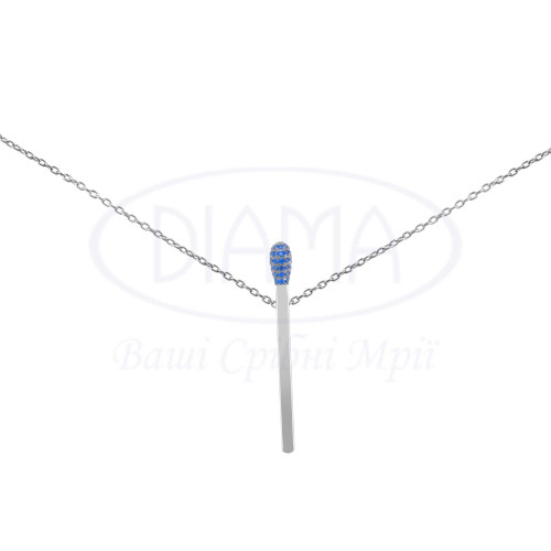 Срібне кольє в формі Сірника з синім цирконом. Срібло 925 проби, покрите родієм. Розмір головного елементу 48*4,5*3мм. В наборі є каблучка, сережки та кольє.