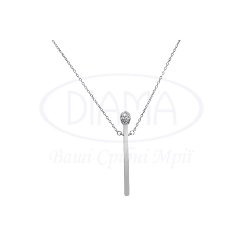 Срібне кольє у формі сірника з білим цирконом. Срібло 925 проби, покрите родієм. Висота сірника - 43,5 мм, товщина - від 2,5 до 5,5 мм.