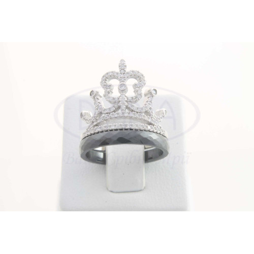 Каблучка срібна в формі корони з чорною граненою керамікою та білим цирконом. Срібло 925 проби, покрите родієм.