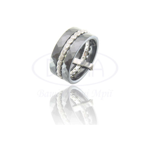 Каблучка з чорної граненої кераміки зі сріблом. Вставка - циркон білий. Срібло 925 проби, покрите родієм.