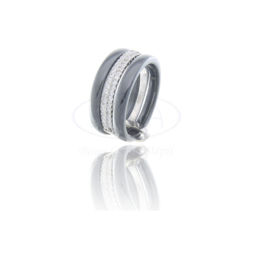 Каблучка срібна з чорною ювелірною керамікою, а також з подвійною доріжкою з білого циркону. Срібло 925 проби, покрите родієм.
