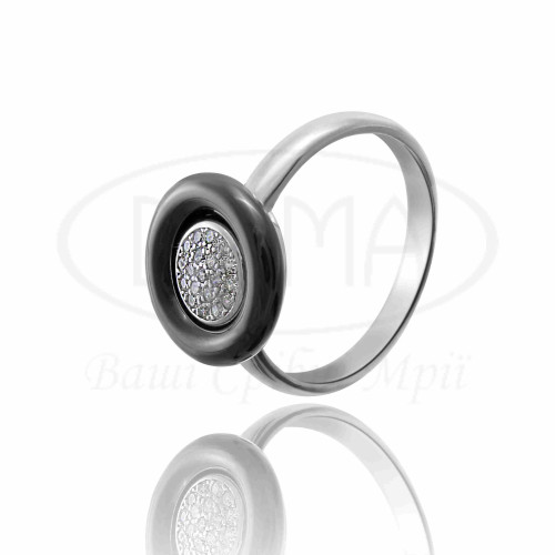 Каблучка срібна з чорною керамікою та камінцями білого циркону. Срібло 925 проби, покрите родієм.