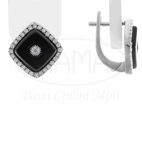 Срібні сережки з чорною керамічною вставкою та цирконом. Срібло 925 проби, покрите родієм. В наборі присутні каблучка, сережки та підвіска.