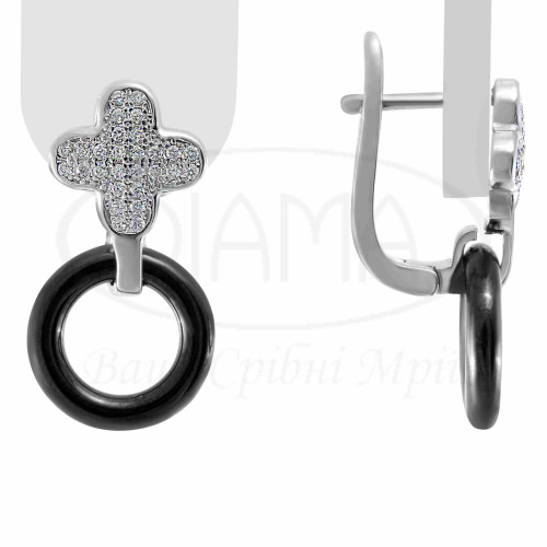 Срібні сережки у формі "Клевер" з білим цирконом та кільцем з чорної кераміки. Срібло 925 проби, покрите родієм.