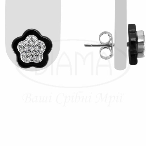 Срібні сережки з чорною керамікою та білим цирконом у формі квітки. Срібло 925 проби, покрите родієм.