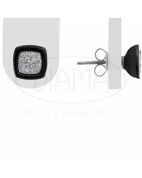 Сережки срібні з чорною керамікою у формі квадрату та білим цирконом. Срібло 925 проби, покрите родієм.