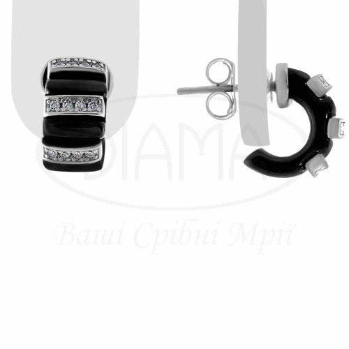 Срібні сережки з чорною керамікою та білим цирконом. Срібло 925 проби, покрите родієм.