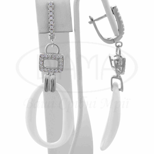 Сережки срібні з білою керамікою овальної форми та білим цирконом. Срібло 925 проби, покрите родієм.