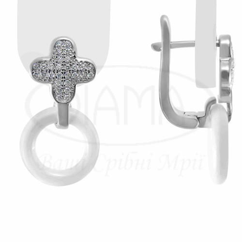 Срібні сережки у формі "Клевер" з білим цирконом та кільцем з білої кераміки. Срібло 925 проби, покрите родієм.