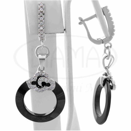 Сережки срібні з білим цирконом та чорною керамікою у формі кола. Срібло 925 проби, покрите родієм.