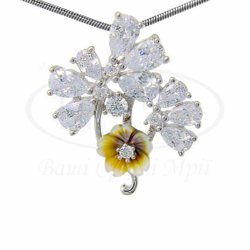 Срібна підвіска з білим цирконом та перламутром. Срібло 925 проби, покрите родієм. Комплект виконаний в стилі Роберто Браво, у формі квітів. Складається з каблучки, підвіски та сережок.