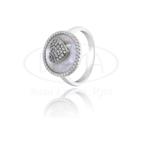 Срібна каблучка з білим перламутром та білим цирконом. Срібло 925 проби, покрите родієм. Комплект складається з каблучки та сережок.