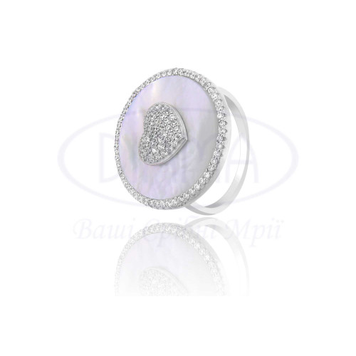 Срібна каблучка з білим перламутром та білим цирконом у формі серця. Срібло 925 проби, покрите родієм.