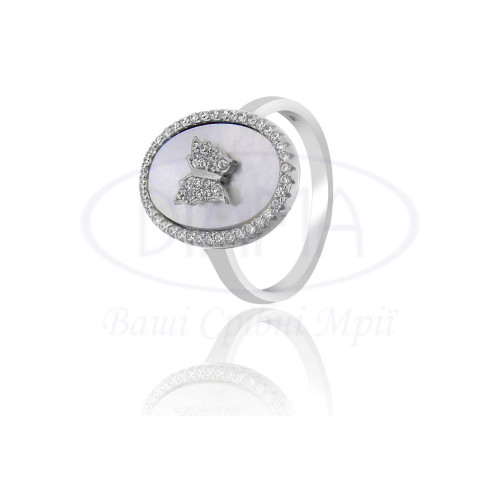 Срібна каблучка з білим перламутром та білим цирконом. Срібло 925 проби, покрите родієм. Комплект складається з каблучки та сережок.