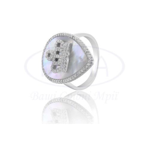 Срібна каблучка з білим перламутром та білим цирконом. Срібло 925 проби, покрите родієм.