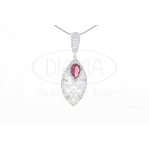 Срібна підвіска з білим перламутром, червоним та білим цирконом. Срібло 925 проби, покрите родієм. В комплекті присутні каблучка, підвіска та сережки.