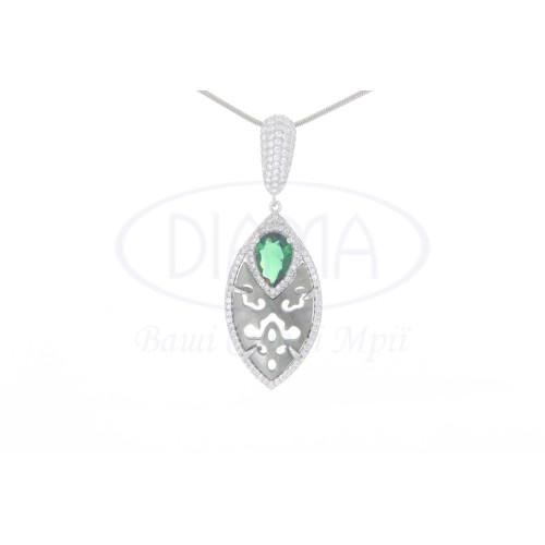 Срібна підвіска з чорним перламутром, зеленим та білим цирконом. Срібло 925 проби, покрите родієм. В комплекті присутні каблучка, підвіска та сережки.