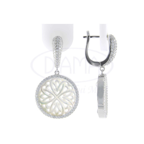 Срібні сережки з білим перламутром та білим цирконом. Срібло 925 проби, покрите родієм. Комплект складається з сережок та підвіски.