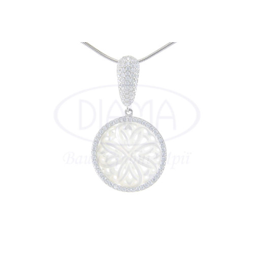 Срібна підвіска з білим перламутром та білим цирконом. Срібло 925 проби, покрите родієм. Комплект складається з сережок та підвіски.