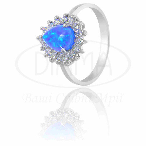 Каблучка срібна з синім опалом та білим цирконом у формі краплі. Срібло 925 проби, покрите родієм.
