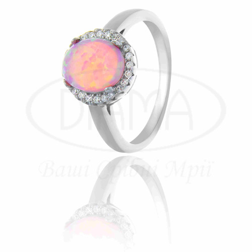 Срібна каблучка з рожевим опалом та білим цирконом. Срібло 925 проби, покрите родієм. Комплект включає в себе каблучку, підвіску та сережки.