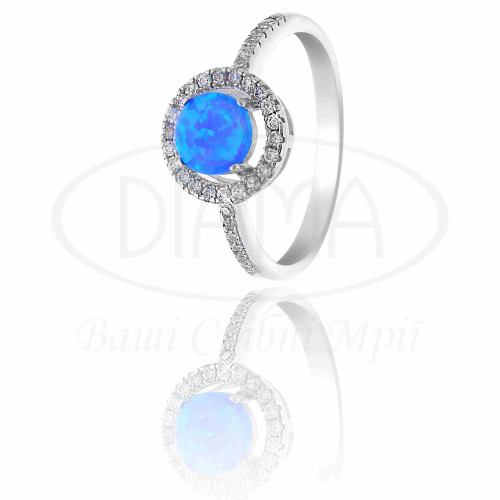 Каблучка срібна з синім опалом та білим цирконом. Срібло 925 проби, покрите родієм. До комплекту входить каблучка, підвіска та сережки.