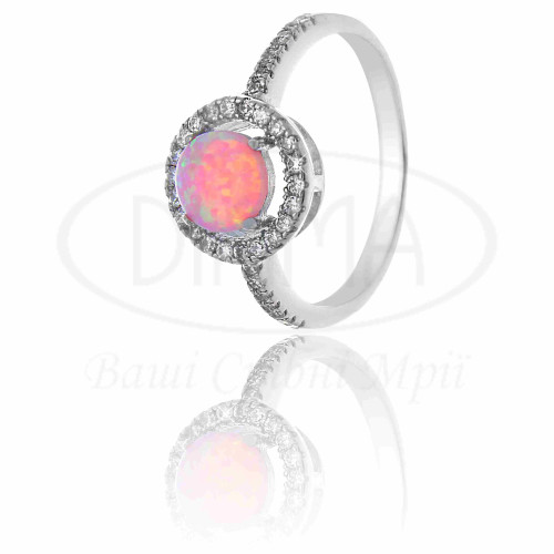 Каблучка срібна з рожевим опалом та білим цирконом. Срібло 925 проби, покрите родієм. До комплекту входить каблучка, підвіска та сережки.