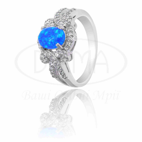 Каблучка срібна з синім опалом та білим цирконом. Срібло 925 проби, покрите родієм. В комплекті каблучка та сережки.