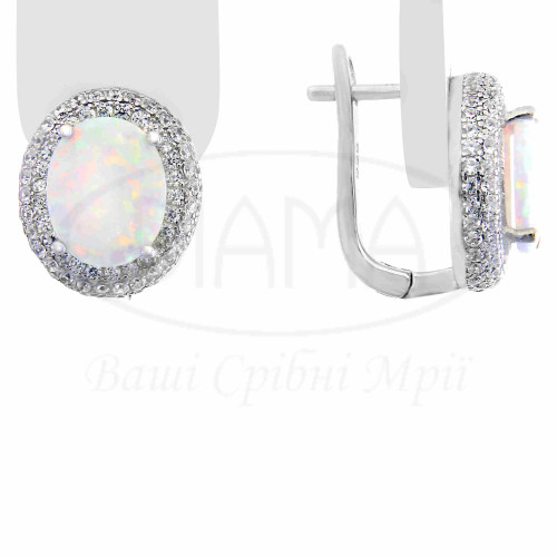 Срібні сережки з білим Опалом та білим цирконом. Срібло 925 проби, покрите родієм. В наборі присутні каблучка, сережки та підвіска.