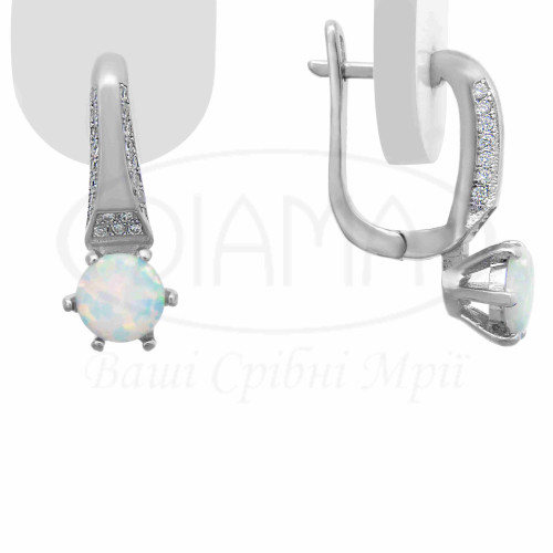 Срібні сережки з білим круглим опалом та цирконом. Срібло 925 проби, покрите родієм. В наборі присутні Каблучка, сережки та підвіска.