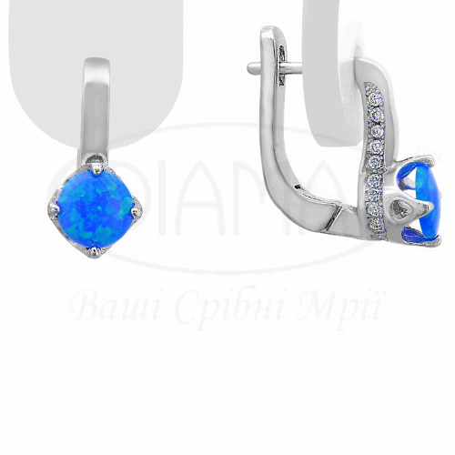 Срібні сережки з синім круглим опалом та цирконом. Срібло 925 проби, покрите родієм. В наборі присутні Каблучка, сережки та підвіска.