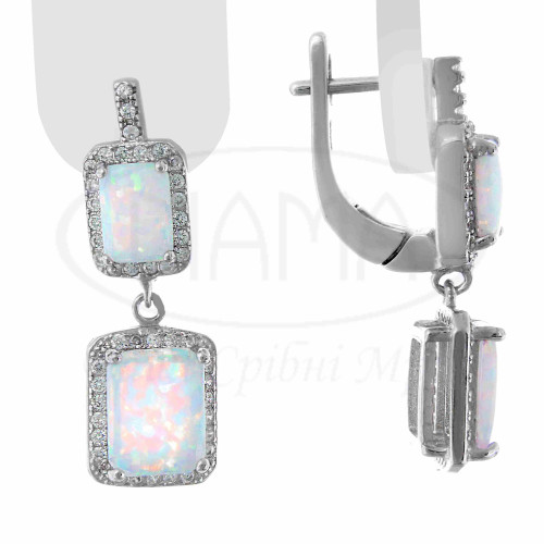 Срібні сережки з двома прямокутними білими Опалами та білим цирконом. Срібло 925 проби, покрите родієм. Комплект складається з каблучки, підвіски та сережок.