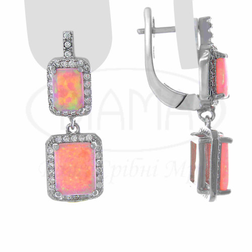 Срібні сережки з двома прямокутними рожевими Опалами та білим цирконом. Срібло 925 проби, покрите родієм. Комплект складається з каблучки, підвіски та сережок.