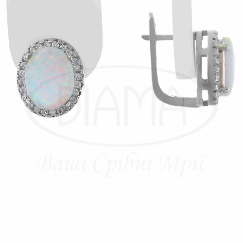 Срібні сережки з білим опалом та білим цирконом. Срібло 925 проби, покрите родієм. Комплект включає в себе каблучку, підвіску та сережки.