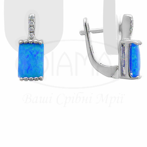 Сережки срібні з синім прямокутним опалом та цирконом. Срібло 925 проби, покрите родієм. В наборі присутні Каблучка, сережки та підвіска.