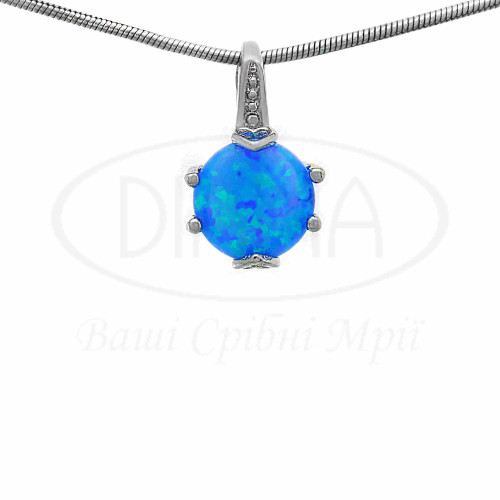 Срібна підвіска з синім круглим опалом. Срібло 925 проби, покрите родієм. В наборі присутні Каблучка, сережки та підвіска.