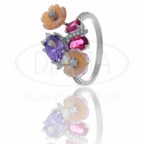Срібна каблучка з кольоровим цирконом та перламутром. Срібло 925 проби, покрите родієм. Комплект виконаний в стилі Роберто Браво, у формі квітів. Складається з каблучки, підвіски та сережок.