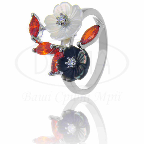 Срібна каблучка з кольоровим цирконом та перламутром, в стилі Роберто Браво. Срібло 925 проби, покрите родієм. В наборі присутні каблучка, підвіска та сережки.