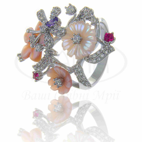 Срібна каблучка з цирконом та перламутром, виконана в стилі Роберто Браво. Срібло 925 проби, покрите родієм. Складається комплект з каблучки, підвіски та сережок.