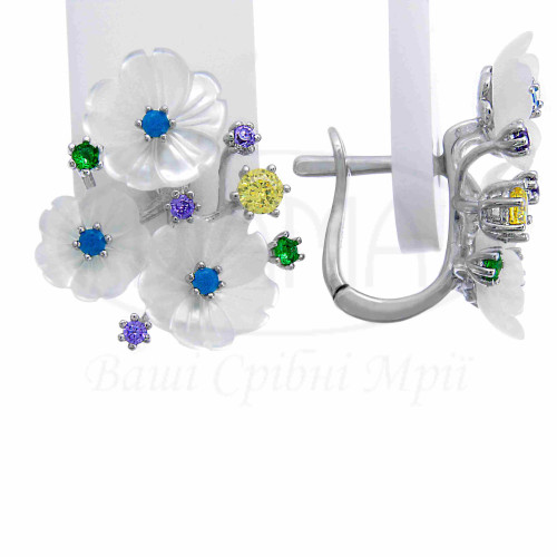 Срібні сережки з цирконом та перламутром, виконані в стилі Роберто Браво. Срібло 925 проби, покрите родієм. Складається комплект з каблучки, підвіски та сережок.