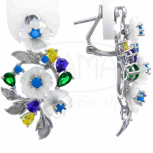 Срібні сережки з кольоровим цирконом та перламутром, в стилі Роберто Браво. Срібло 925 проби, покрите родієм. В наборі присутні каблучка, підвіска та сережки.