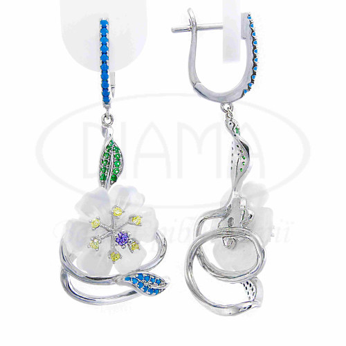 Сережки срібні з кольоровим цирконом та перламутром, в стилі Роберто Браво. Срібло 925 проби, покрите родієм. В наборі присутні каблучка, сережки та підвіска.