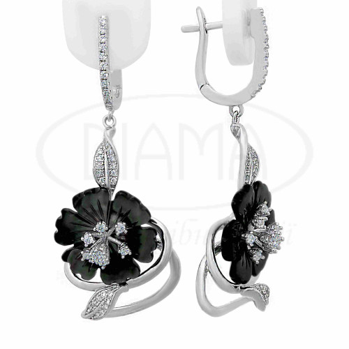 Сережки срібні з білим цирконом та чорним перламутром, в стилі Роберто Браво. Срібло 925 проби, покрите родієм. В наборі присутні каблучка, сережки та підвіска.