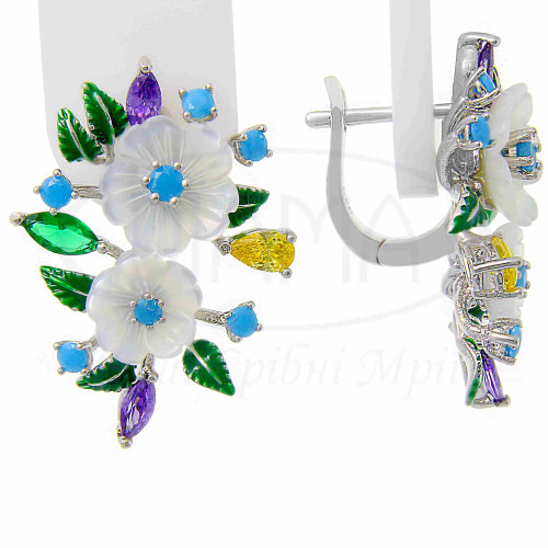 Срібні сережки з кольоровим цирконом, емаллю та перламутром. Срібло 925 проби, покрите родієм. Комплект виконаний в стилі Роберто Браво, у формі квітів. Складається з каблучки та сережок.