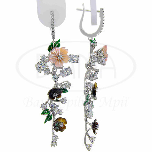 Срібні сережки з кольоровим цирконом, емаллю та перламутром. Срібло 925 проби, покрите родієм. Комплект виконаний в стилі Роберто Браво, у формі квітів. Складається з каблучки та сережок.